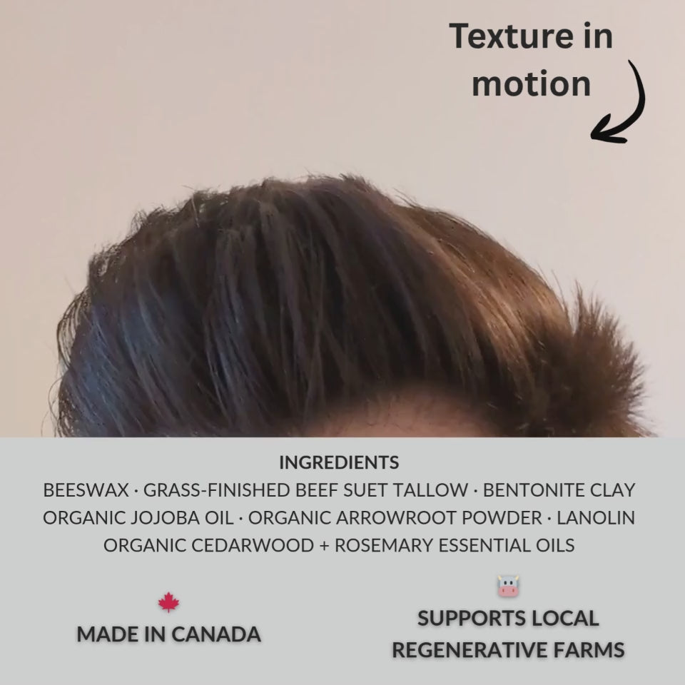 Wild Clay is a tallow-based hair styling product made for short to medium-length hair. It uses just 8 real, simple ingredients to give you a natural, flexible, high-volume hold with no crunch, shine, or grease. It’s normally firm-but-scoopable straight from the tin. In colder months or after shipping, it can set up a bit firmer. If that happens, a few seconds of pressing and massaging the surface with your thumb softens it so you can scoop it out and work it between your fingers.